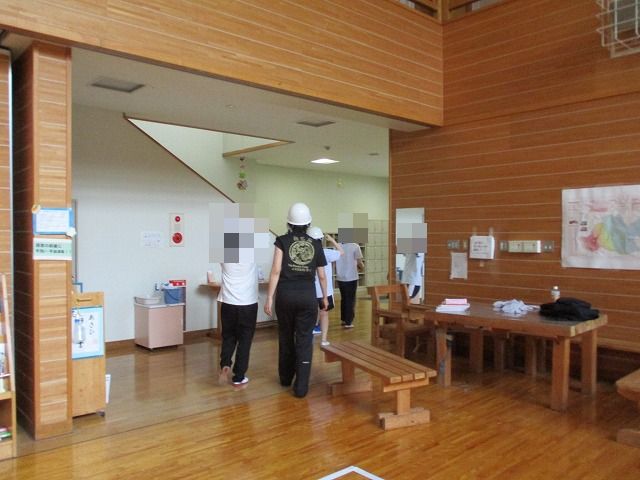 避難訓練は予告なしでしたが、訓練の放送がかかると、ヘルメットをすぐに被ったり、机の下に隠れたりして身の安全を考えながら、行動する様子が見られました。避難する際には、先生の指示に従って行動することもできていました。
