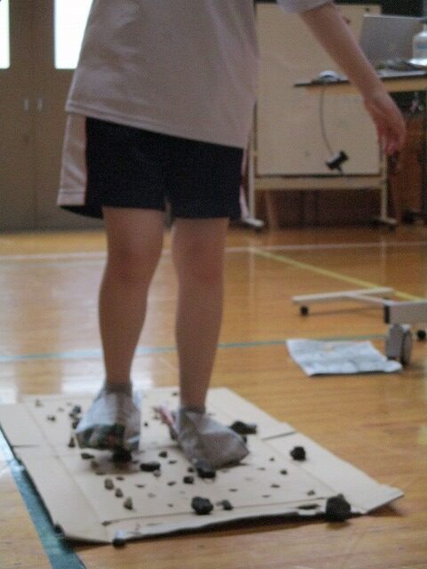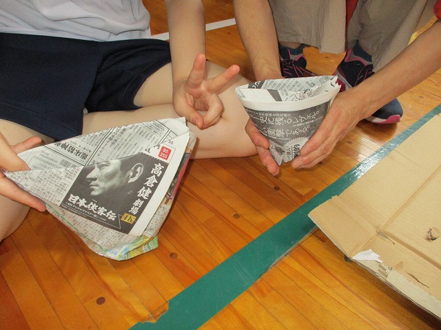 その後、防災教室の授業では、地震などの災害が起きた際に、あると便利な3種の神器(ポリ袋、新聞紙、ラップ)を学び、新聞紙でスリッパやお皿を作る学習をしました。みんな先生に教わりながら、一生懸命作っていましたよ。また作ったスリッパと素足ででこぼこ道を歩いて比較をし、スリッパの有用性を実感していました。
