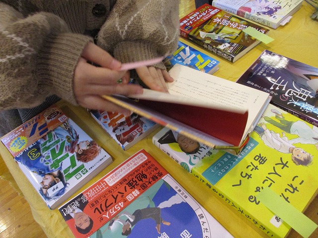 山梨県立富士見支援学校旭分校 > 教育活動 > R4年度 授業の様子⑱(出張本屋さん) 2022年10月20日カテゴリー: 教育活動 R4年度 授業の様子⑱(出張本屋さん) 10月19日の4、5校時帯に春光堂書店さんをお招きして、出張本屋さんという活動をしました。 春光堂書店さんが180冊もの本を持ってきてくださり、本校のホールに展示してくださいました。 最初のはじめの会では、春光堂書店さんの紹介と、トークライブをしました。生徒からも活発に質問が出て、春光堂書店さんがその質問1つ1つにとても丁寧に答えてくださりました。 その後、みんなでたくさん本を見たり、読んだりしました。生徒は5冊、教師は3冊お気に入りの本を見つけて投票する活動もしましたよ(*^-^*)みんな本に夢中になっていました。事前にリクエストした本も持ってきてくださったので、リクエストした本を見つけるととても嬉しそうに読んでいる様子も見られました(*^-^*) 投票で票が多く入った本は、今後購入して本校の図書室に置く予定です。 とてもいい雰囲気の中、たくさんの本に触れることができ、実りある時間でした。春光堂書店さん、ありがとうございました(*^-^*)
