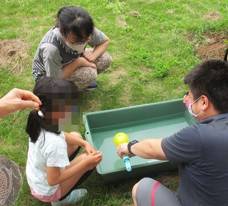 坂道を転がってくる水風船を、割りばしで捕まえて的当てをしました。