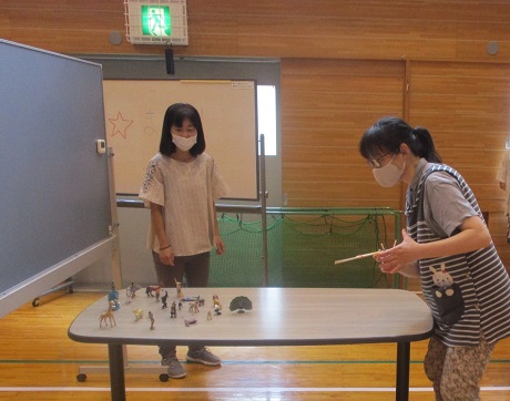 作成した割りばし鉄砲を使って、人形を倒しました。